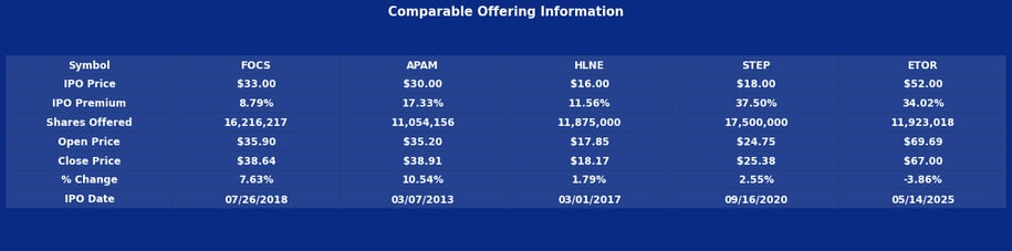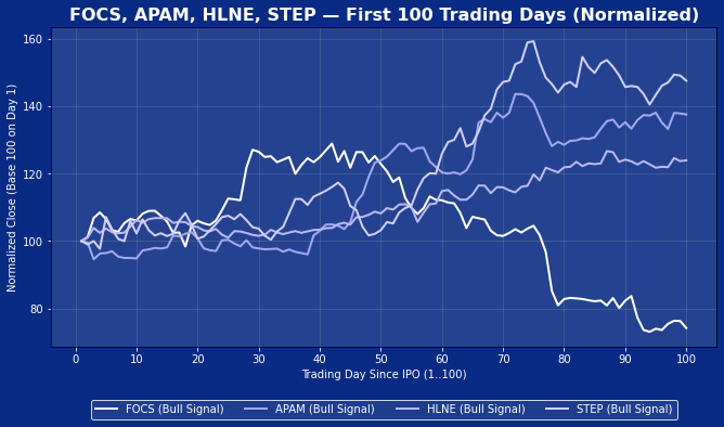 In Wealthfront’s case, the appropriate mental model is that of a technology-enabled financial adviser. The company uses software to deliver a disciplined, systematic, and highly consistent advisory experience, but the underlying economics remain fee-based, similar to traditional wealth-management firms. Because of this, we find it useful to anchor our analysis with the IPOs of Focus Financial (FOCS), Artisan Partners (APAM), Hamilton Lane (HLNE), and StepStone (STEP). Each represents a scaled advisory or asset-management platform with public-market trading patterns that reflect what investors typically expect from fee-driven businesses: stable openings, measured follow-through, and solid—but rarely explosive—100-day performance.