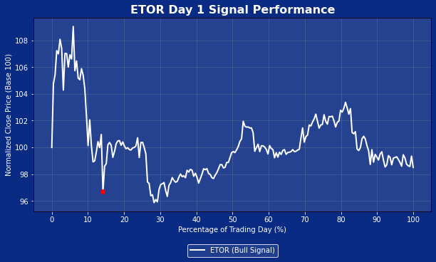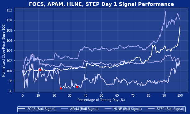The Day-One analogue plot reinforces the idea that advisory-style IPOs generally produce benign, controlled trading sessions regardless of whether a Bull Signal is triggered. All four offerings—FOCS, APAM, HLNE, and STEP—opened cleanly and settled quickly into narrow intraday ranges, with virtually no signs of the sharp upside extensions that characterize higher-beta consumer tech or transactional fintech debuts. Even STEP, the strongest analogue, showed strength expressed as gradual firming, not a breakout. Drawdowns were shallow and intraday volatility remained modest across the group, suggesting that institutional investors, rather than speculative flows, tend to dominate price discovery in this category. In short, a Bull Signal in these offerings generally reflects stable trading, not intense momentum—useful context when thinking about WLTH’s potential Day-One behavior.