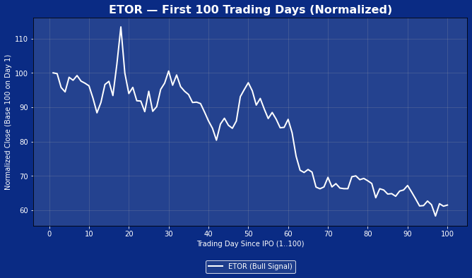 eToro is worth a proximal look given that the offering came to market this year and is somewhat comparable to Wealthfront; to that end, it’s clear that bull was grabbed by the horns and tossed out to pasture. Despite an early bull signal, ETOR’s first day quickly slipped into a fading tape where initial strength evaporated and buyers never re-engaged with conviction. That early weakness proved to be a fair tell: over the first 100 days, ETOR drifted steadily lower — roughly a 40% decline — with only brief, non-directional rallies interrupting the slide. The broader takeaway is that early enthusiasm only matters if it converts into persistent demand, and ETOR’s trajectory is a reminder of how swiftly an IPO can transition from constructive to structurally fragile when the market steps aside.