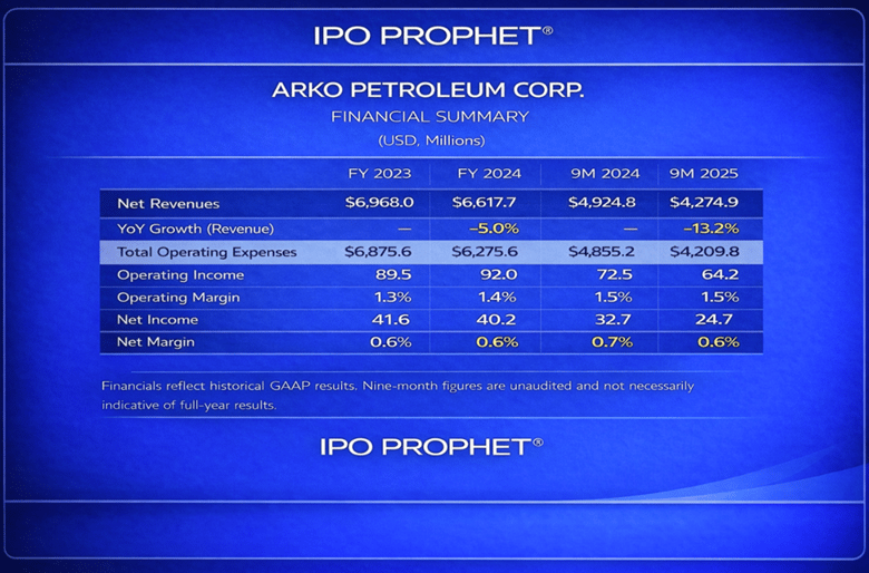 Overall, ARKO Petroleum’s IPO offers investors exposure to a scaled, essential fuel logistics platform with defensive characteristics and recurring cash flow potential. While the business does not exhibit high growth or technology-style margins, its infrastructure footprint and steady demand profile position it as a stable participant in the downstream energy value chain.
