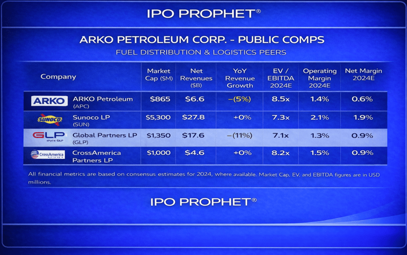 Comparable publicly traded peers include downstream fuel distributors and terminal operators such as Sunoco LP (SUN), Global Partners LP (GLP), and Cross America Partners LP (CAPL). These companies share similar characteristics: large revenue bases driven by fuel pass-through costs, low single-digit operating margins, and valuations tied more closely to EBITDA and cash flow than revenue growth. Relative to this group, ARKO enters the public markets as a smaller-cap, pure-play wholesale distributor with comparable margin economics and exposure to stable transportation fuel demand.