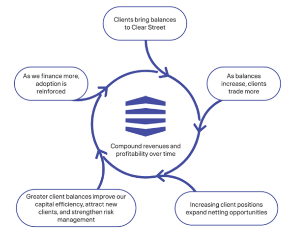 Unlike traditional broker-dealers that rely on outsourced clearing and fragmented workflows, Clear Street consolidates execution, clearing, custody, securities lending, and financing onto a unified platform. Management believes this architecture enables faster product development, tighter risk management, and lower structural costs, positioning the firm to gain share as regulatory complexity and capital requirements continue to rise across the broker-dealer ecosystem.