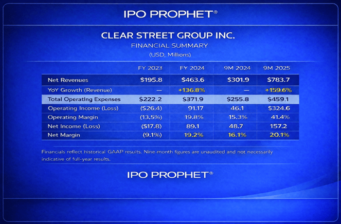 Financially, Clear Street has demonstrated rapid top-line expansion and improving operating leverage. Net revenues more than doubled in 2024 and continued accelerating through the first nine months of 2025, while operating margins expanded meaningfully as fixed infrastructure costs scaled across a larger client base. The company generated positive operating income in both 2024 and year-to-date 2025, with profitability increasing alongside revenue growth, reflecting management’s emphasis on automation and owned infrastructure.