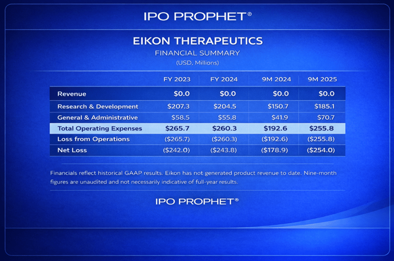 As is typical for a late-stage clinical biotechnology company, Eikon has not yet generated product revenue and continues to operate at a net loss as it funds research and development across multiple programs. As of year-end 2025, the company reported approximately $336 million in cash, cash equivalents, and short-term investments, providing runway to advance key clinical milestones. Proceeds from the IPO are expected to be used primarily to fund ongoing and planned registrational trials, expand pipeline development, and support continued investment in the company’s technology platform.