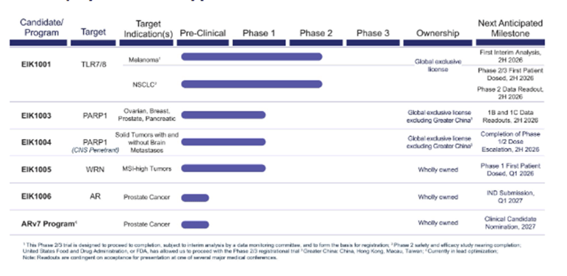 What differentiates Eikon from many clinical-stage peers is the degree to which its discovery platform is embedded into its development strategy. Rather than operating as a single-asset biotech, the company is positioning itself as a long-term oncology innovation engine, capable of generating internally derived candidates while selectively in-licensing external programs that benefit from its platform and development expertise.