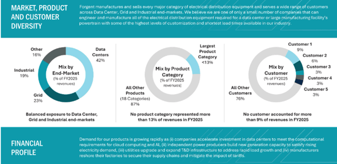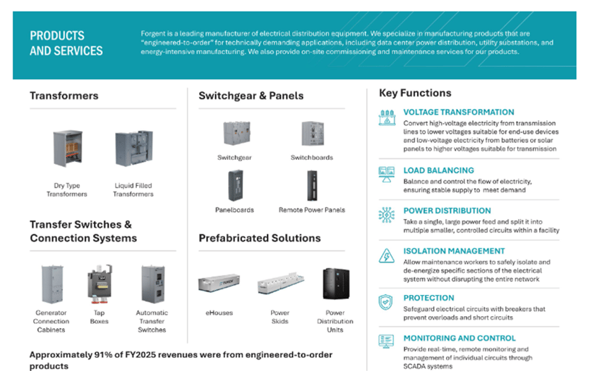 Forgent Power Solutions operates a power infrastructure and electrical solutions platform serving utility, industrial, and critical infrastructure end markets. The company’s operations are focused on the design, manufacture, and servicing of transformer and power distribution equipment that supports grid modernization, electrification, and capacity expansion across North America. Demand for these solutions has been supported by aging grid infrastructure, rising electricity consumption, data center development, and increasing investment in transmission and distribution networks.