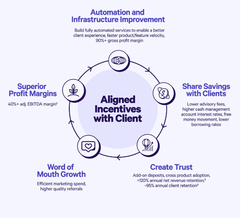 Founded in 2008, Wealthfront has evolved from an early robo-advisor into a comprehensive financial platform designed for digital-native clients. The company offers automated investment portfolios, high-yield cash accounts, financial planning tools, and secured credit features under a single, mobile-first experience. Management highlights predictable recurring revenue, a high degree of automation, and impressive customer durability, with retention rates exceeding 95% across the platform. Today, Wealthfront manages more than $88 billion in platform assets, supported by a distribution strategy focused on referrals, content-driven acquisition, and long-term client relationships rather than costly advisory sales cycles typical of traditional wealth managers.