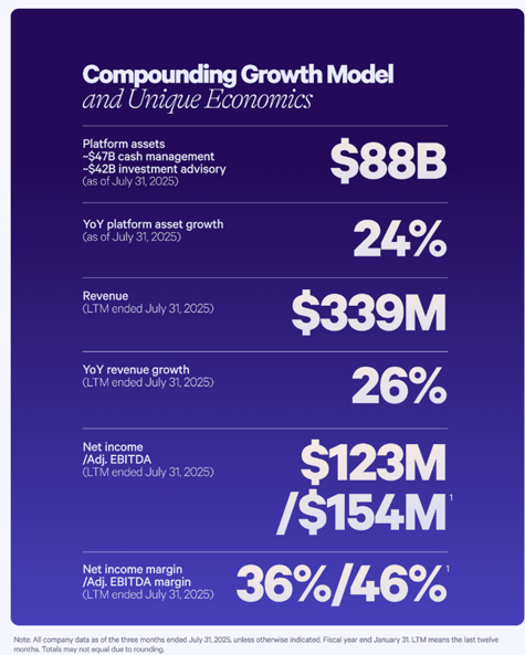 Wealthfront’s financial profile is notable for its unusual combination of scale, growth, and profitability. Revenue grew approximately 24% year over year, while adjusted EBITDA margins remain in the mid-40% range. With client retention above 95% and platform assets of approximately $88 billion, the company is positioned as a differentiated fintech operator with consistent unit economics driven by automation and recurring fee streams. Management plans to use IPO proceeds to enhance technology capabilities, expand product development, and invest in automated planning tools to deepen customer engagement.