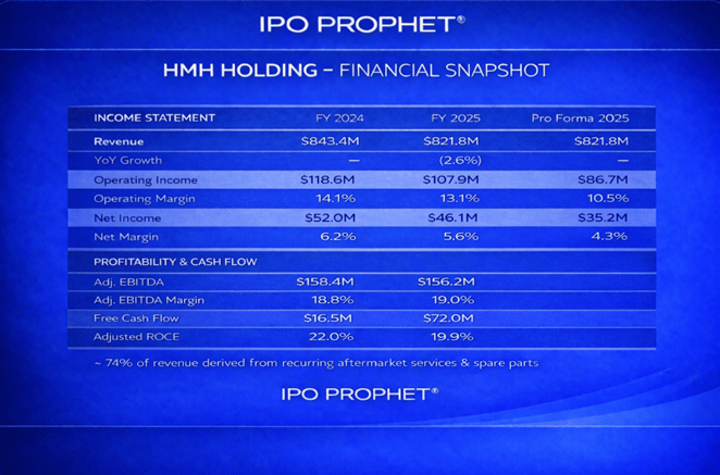 From a financial perspective, the company presents a relatively balanced profile compared to many industrial IPO candidates. HMH generated $46.1 million of net income in 2025, with adjusted EBITDA margins of approximately 19%, supported by an asset-light operating model that limits capital expenditure requirements to roughly 2–3% of revenue. This combination of profitability and capital efficiency is likely to be a central component of the investment case, particularly in a market environment that is prioritizing cash flow durability over purely top-line growth.
