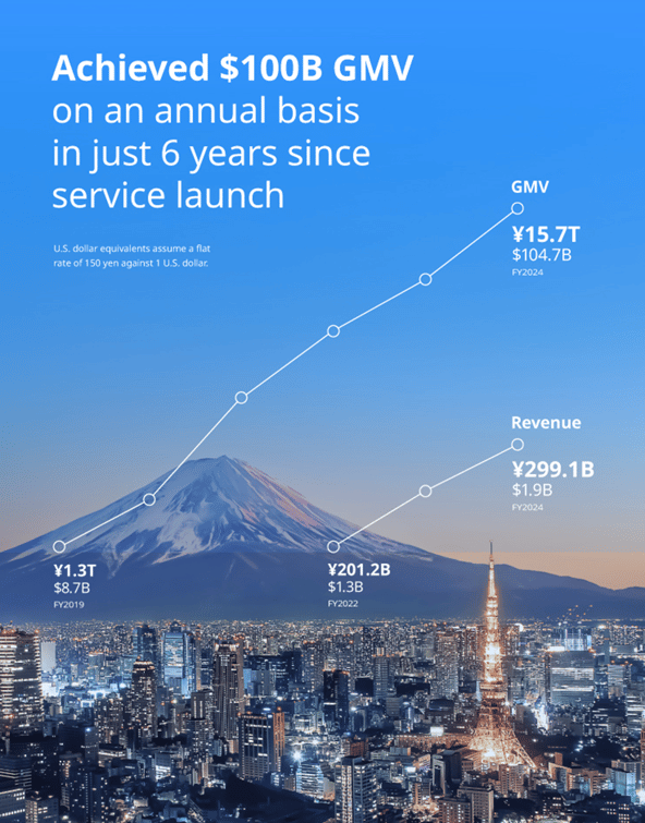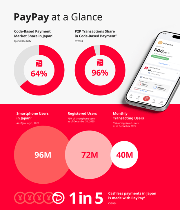 Since its launch, PayPay has grown into one of Japan’s dominant digital wallet and QR payments platforms. For the fiscal year ended March 31, 2025, the company reported approximately $104.7 billion in gross merchandise value (¥15.7 trillion), up from roughly $8.7 billion in fiscal 2019 — a twelvefold expansion in six years. Revenue reached approximately $1.99 billion (¥299.1 billion) in fiscal 2025, implying a take rate near 1.9%. With 72 million registered users and approximately 40 million monthly transacting users, PayPay now accounts for roughly one in five cashless payments in Japan, positioning it at the center of the country’s structural transition away from physical currency. Japan remains comparatively underpenetrated in digital wallet adoption relative to several Western and Asian markets, suggesting continued runway for wallet usage growth, merchant monetization, and financial services expansion layered on top of PayPay’s core payments infrastructure.