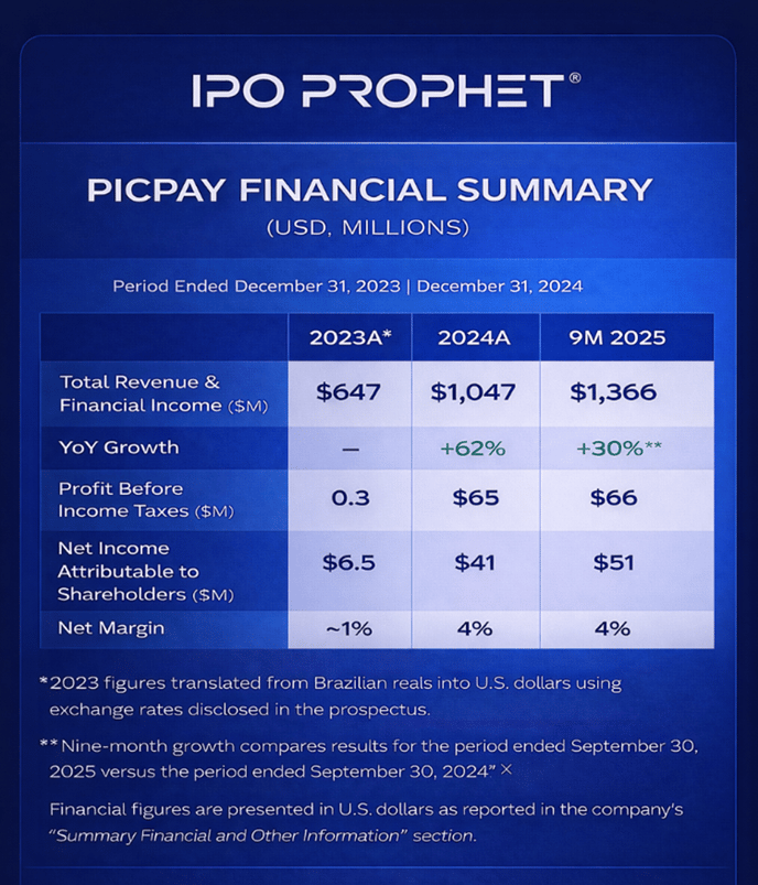 Momentum continued into 2025. For the nine months ended September 30, 2025, PicPay reported $1.37 billion in total revenue and financial income, representing approximately 30% growth compared with the same period in 2024. Profit before income taxes totaled $66 million, while net income attributable to shareholders reached $51 million, underscoring the company’s ability to sustain profitability while continuing to invest in product expansion, credit offerings, and ecosystem development. All financial figures are presented in U.S. dollars as reported in the company’s “Summary Financial and Other Information” section and translated using exchange rates disclosed in the prospectus.
