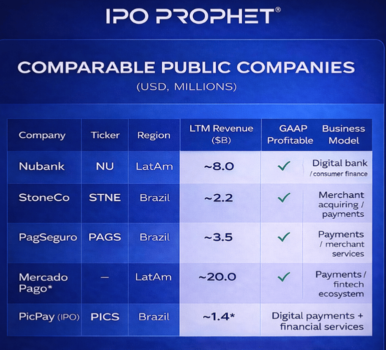 From a valuation perspective, PicPay’s IPO positions the company among emerging-market digital banks and payments platforms, rather than U.S.-listed fintech infrastructure providers. The most relevant public comparables include Nubank, StoneCo, and PagSeguro, all of which operate at scale in Latin America and generate meaningful revenue from payments, banking, and merchant services. Mercado Pago, while not separately listed, also serves as an important benchmark given its role as the fintech arm of MercadoLibre.
