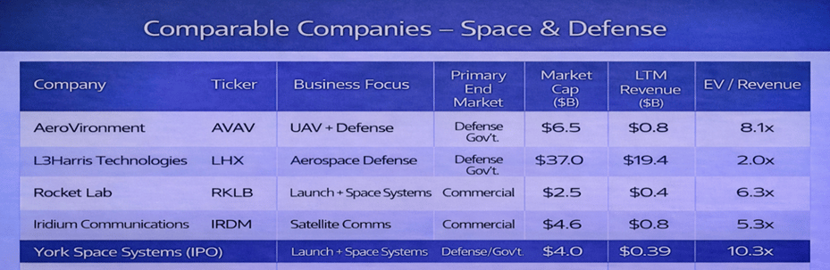 From a comparative perspective, York’s valuation places it above most commercially oriented space peers on a revenue multiple basis, reflecting its heavier exposure to defense and government end markets. Relative to diversified aerospace and defense primes, the company remains earlier in its operating maturity, but offers a more focused growth profile tied directly to satellite platform deployment rather than broader defense system integration. Comparisons with launch providers and satellite communications companies further underscore York’s differentiated role as a platform manufacturer rather than a service- or launch-centric operator.