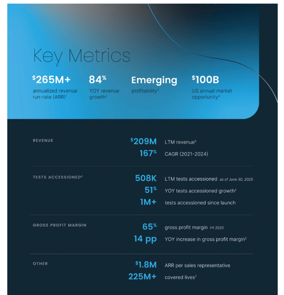 BillionToOne cites a $100 billion annual U.S. market opportunity across prenatal and oncology testing. Its growth trajectory highlights both scale and efficiency: more than one million tests accessioned since launch, with over 225 million covered lives under payor contracts. The company has also demonstrated improving unit economics, with gross margins climbing steadily as volumes expand.