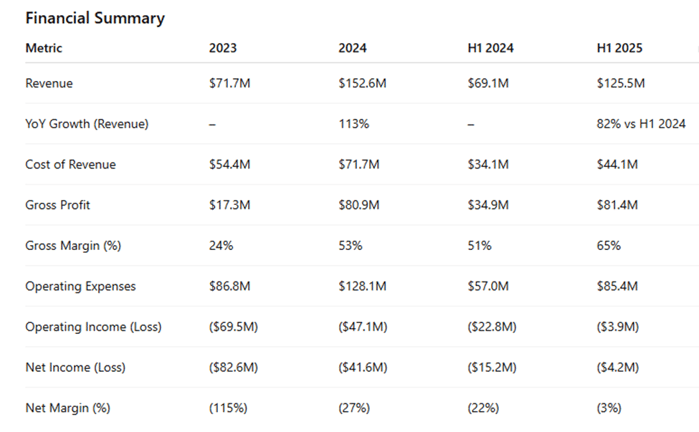 Financially, the numbers highlight a rapid path toward profitability. Revenue grew from $71.7M in 2023 to $152.6M in 2024, and continued momentum delivered 82% year-over-year growth in the first half of 2025. Gross margins surged from 24% in 2023 to 65% in H1 2025, reflecting the scalability of its smNGS platform. Losses are narrowing quickly, with net loss shrinking from $82.6M in 2023 to just $4.2M in the first half of 2025