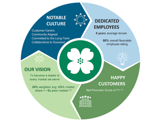 As of September 30, 2025, the company reported $19.2 billion in total assets and $15.4 billion in wealth assets under advice. Through its subsidiary, The Central Trust Bank, it operates 156 branches across Missouri, Kansas, Oklahoma, Colorado, and Florida, maintaining a weighted-average deposit market share of 24%, more than double the peer median of 11%. Central’s success is built on relationship banking and customer retention, with an impressive Net Promoter Score of 71 and an average deposit customer tenure of 13 years.