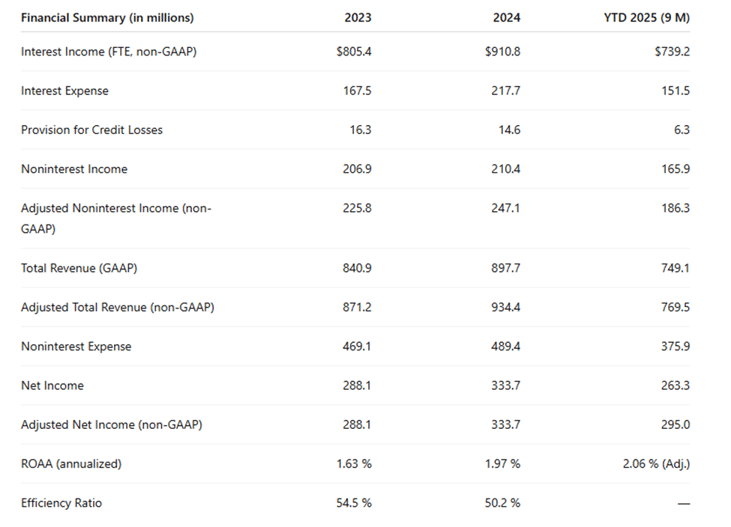 Financially, Central Bancompany presents one of the strongest profiles in the regional banking universe. For the nine months ended September 30, 2025, adjusted revenue totaled $769.5 million, with adjusted net income of $295 million and an annualized ROAA of 2.06%. For 2024, adjusted total revenue was $934.4 million and net income reached $333.7 million, yielding a net margin above 21% and an efficiency ratio of 54.5%. Even during 2023’s liquidity-driven turbulence, the company maintained a return on assets above 1.6%, reinforcing its reputation for durability.