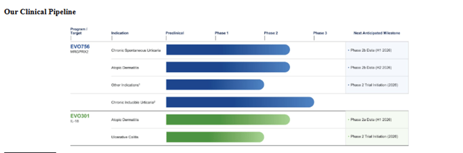 Founded in 2020 by industry veterans Luis Peña and Dr. Eugene Bauer (previously co-founders of Dermira, acquired by Eli Lilly for $1.1 billion), Evommune is focused on unlocking new mechanisms of action in chronic inflammatory conditions such as chronic spontaneous urticaria (CSU), atopic dermatitis (AD), and ulcerative colitis (UC). Its lead candidate, EVO756, is an oral small-molecule antagonist targeting the MRGPRX2 receptor, which plays a key role in mast cell and neuroimmune signaling. A Phase 2b study in CSU is currently underway with readouts expected in 2026. Its second program, EVO301, a fusion protein designed to neutralize IL-18, entered Phase 2 trials in 2025.