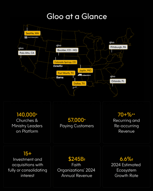 Founded in 2013 in Boulder, Colorado, Gloo is building what it calls a technology platform for the “faith and flourishing ecosystem.” The company connects network capability providers (NCPs)—such as ministries, content publishers, donor service providers, and technology firms—with churches and frontline organizations (CFLs) that deliver worship, education, and community services. Its product suite includes Gloo Workspace, an AI-powered communications and analytics tool for churches; Gloo360, an enterprise technology and data service; and the Gloo Media Network, a fast-growing advertising and donor-engagement business. The company’s acquisition of Outreach, Inc. in 2024 provided one of the largest e-commerce marketplaces for faith-based products, accounting for nearly 88% of revenue in fiscal 2024, and remains Gloo’s core marketplace platform. As of mid-2025, Gloo’s reach extended to more than 140,000 churches and ministry leaders and over 3,000 NCPs, reflecting a strong ecosystem position.