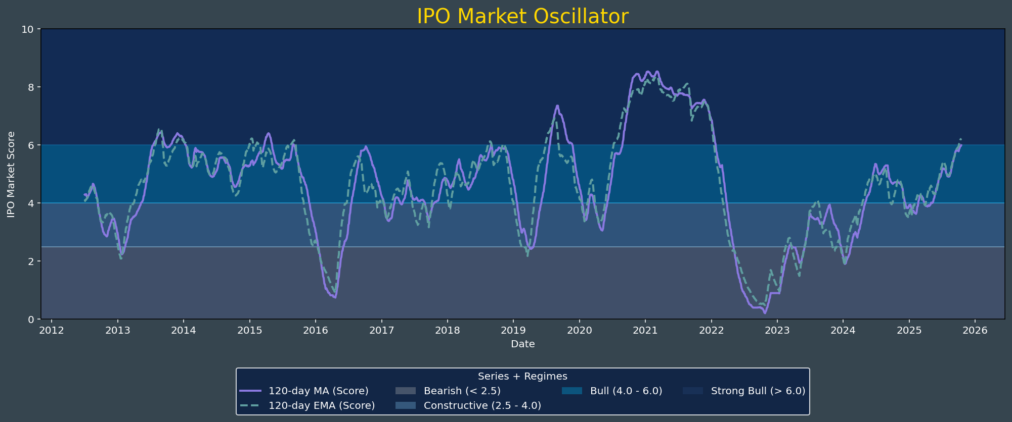 The IPO Market Oscillator has entered a decisive upswing, with its 120-day moving average now rising into the Strong Bull regime for the first time since early 2021. This move reflects a broad and sustained improvement across virtually every dimension of issuance behavior — deal pricing, first-day performance, and technical trading signals.