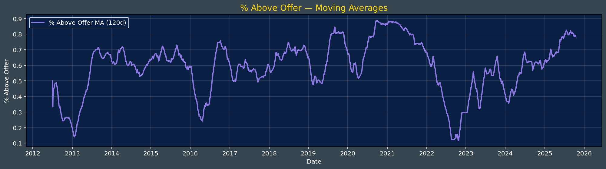 While still below the exuberant highs of 2020–2021, the steady climb in this 120-day average shows constructive engagement and speculative interest returning.