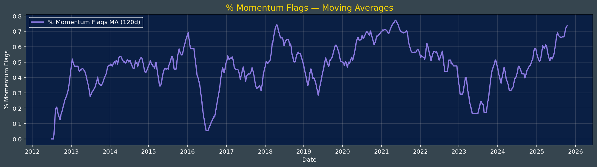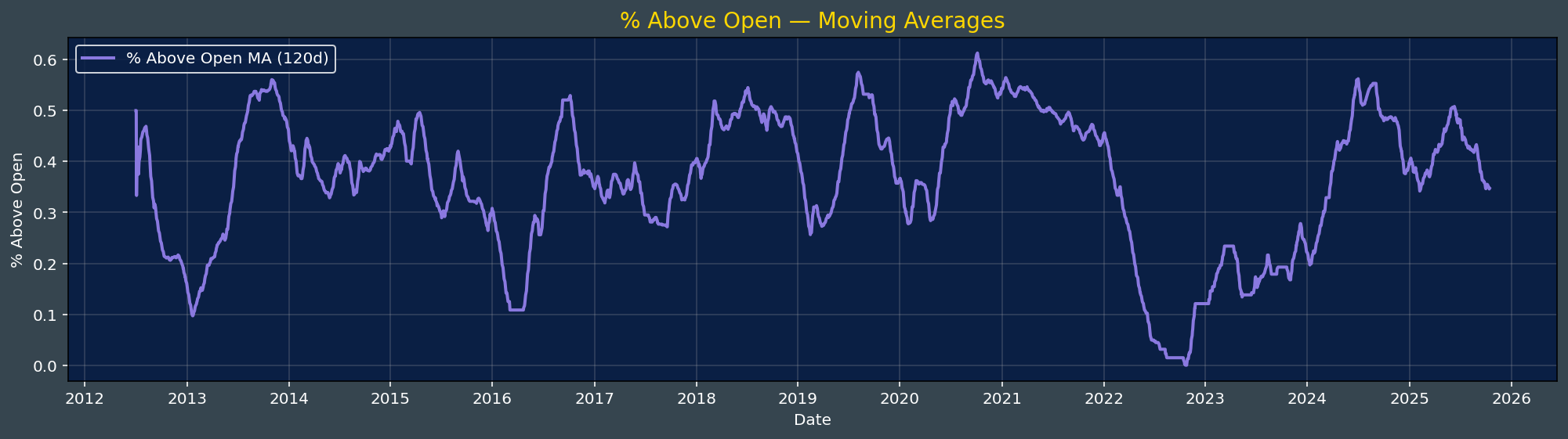 Although not yet at prior peaks, the uptrend in the 120-day average shows deepening market participation and better follow-through in early trading — adding steady, mid-level support to the overall score.