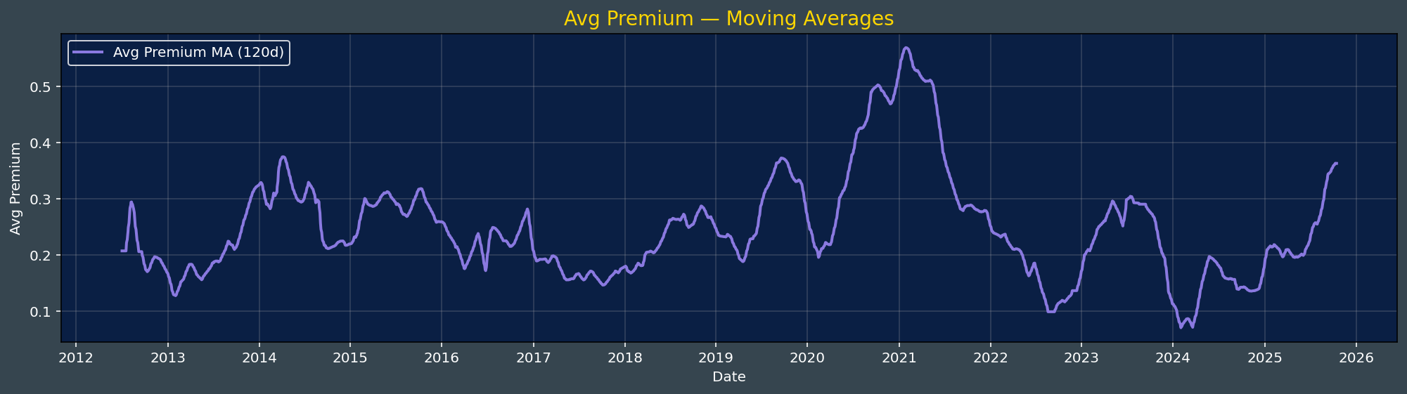 High premiums often accompany exuberant issuance phases; low or negative premiums signal caution and defensive pricing. After a prolonged trough through 2022–2023, the 120-day average has turned decisively higher, indicating that pricing leverage is returning to issuers.