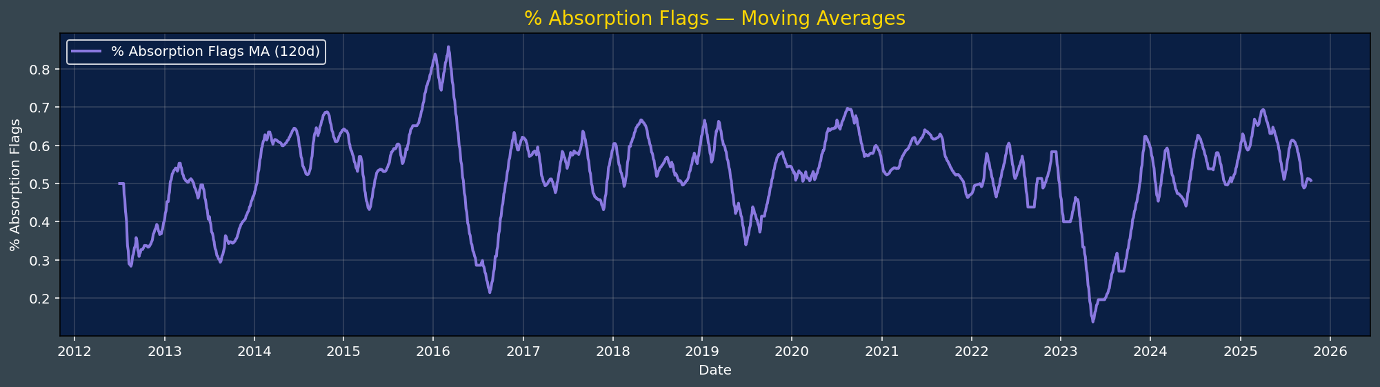 Historically, high readings signal market fatigue and deteriorating breadth; low readings suggest new supply is being efficiently digested.